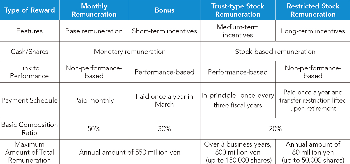 - In order to enhance value sharing with shareholders and to increase incentives to increase corporate value from a medium- to longterm perspective, a portion of remuneration will be stock-based remuneration.